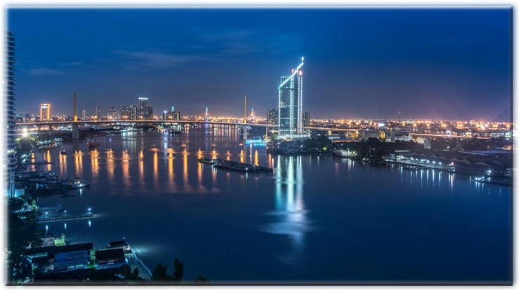 illuminee et sur le fleuve Chao Phaya qui separe